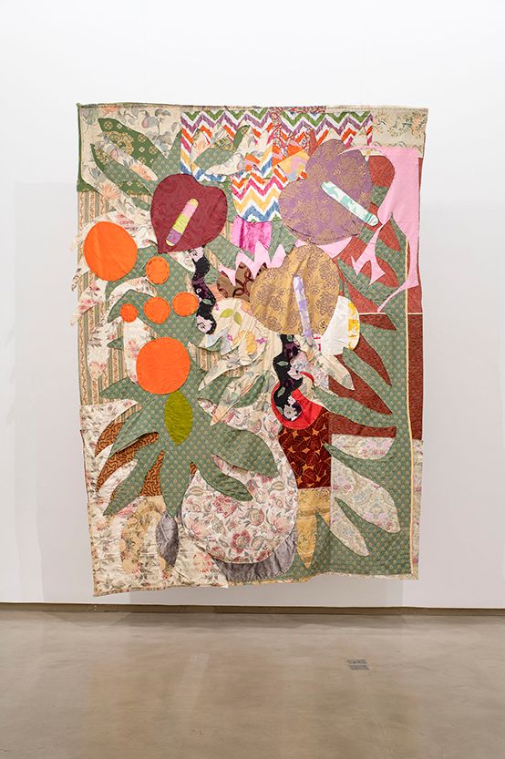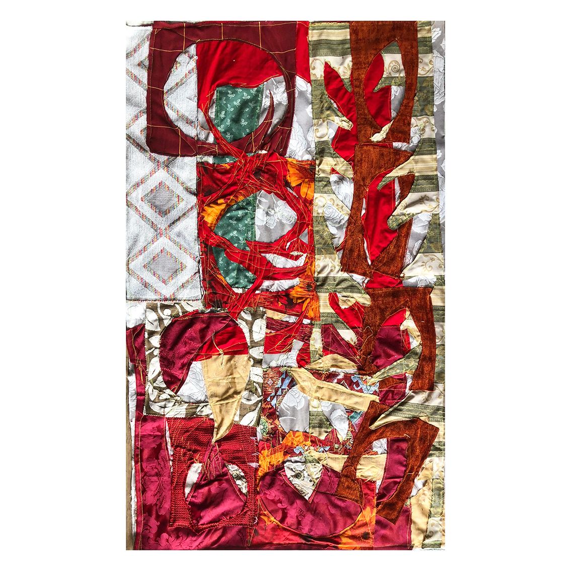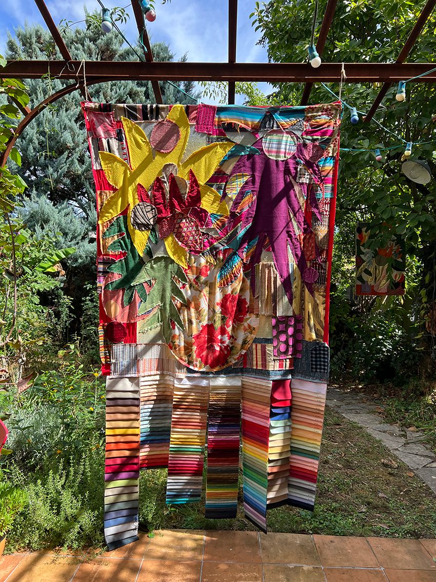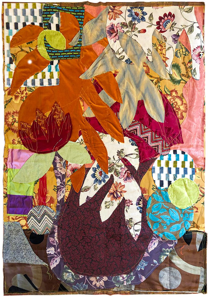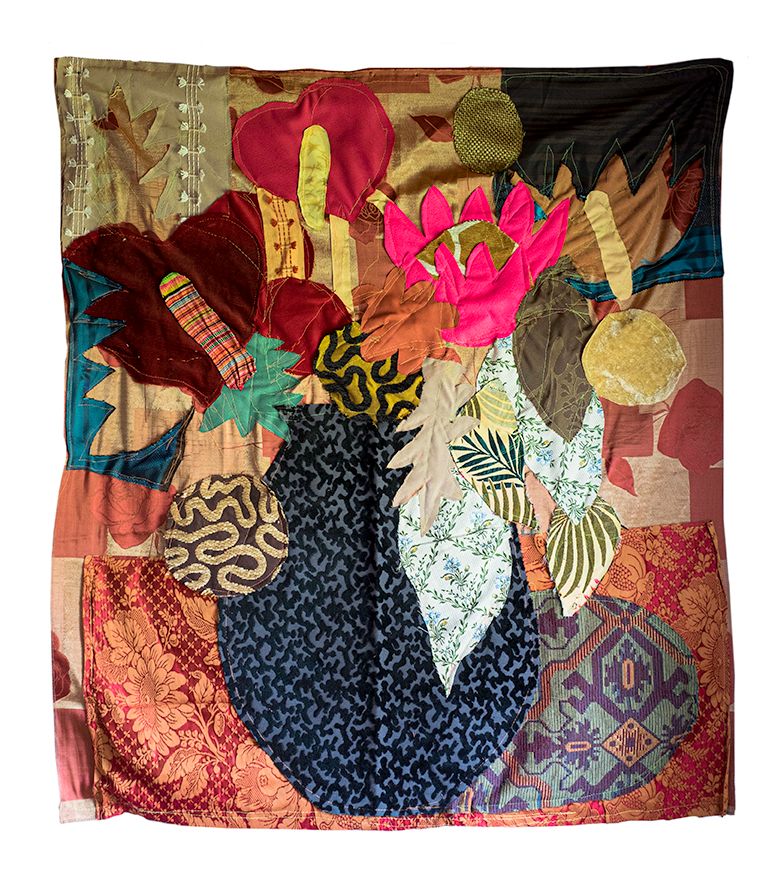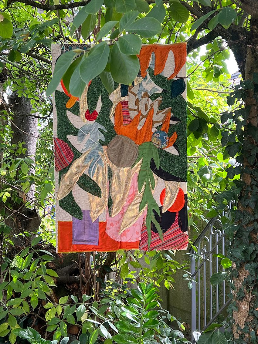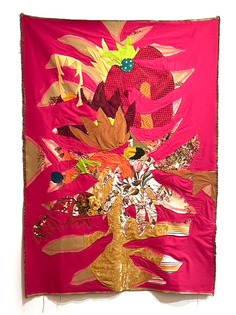 Driven by a fascination with fabrics, the Textile series, started in 2020, aims to create works that reinterpret the motifs of paintings, using new materials and existing patterns, while incorporating elements of vegetation. This results in pictorial compositions with varied volumes, textures, and layers. The reused old tapestry fabrics reveal a dialogue between two cultures.