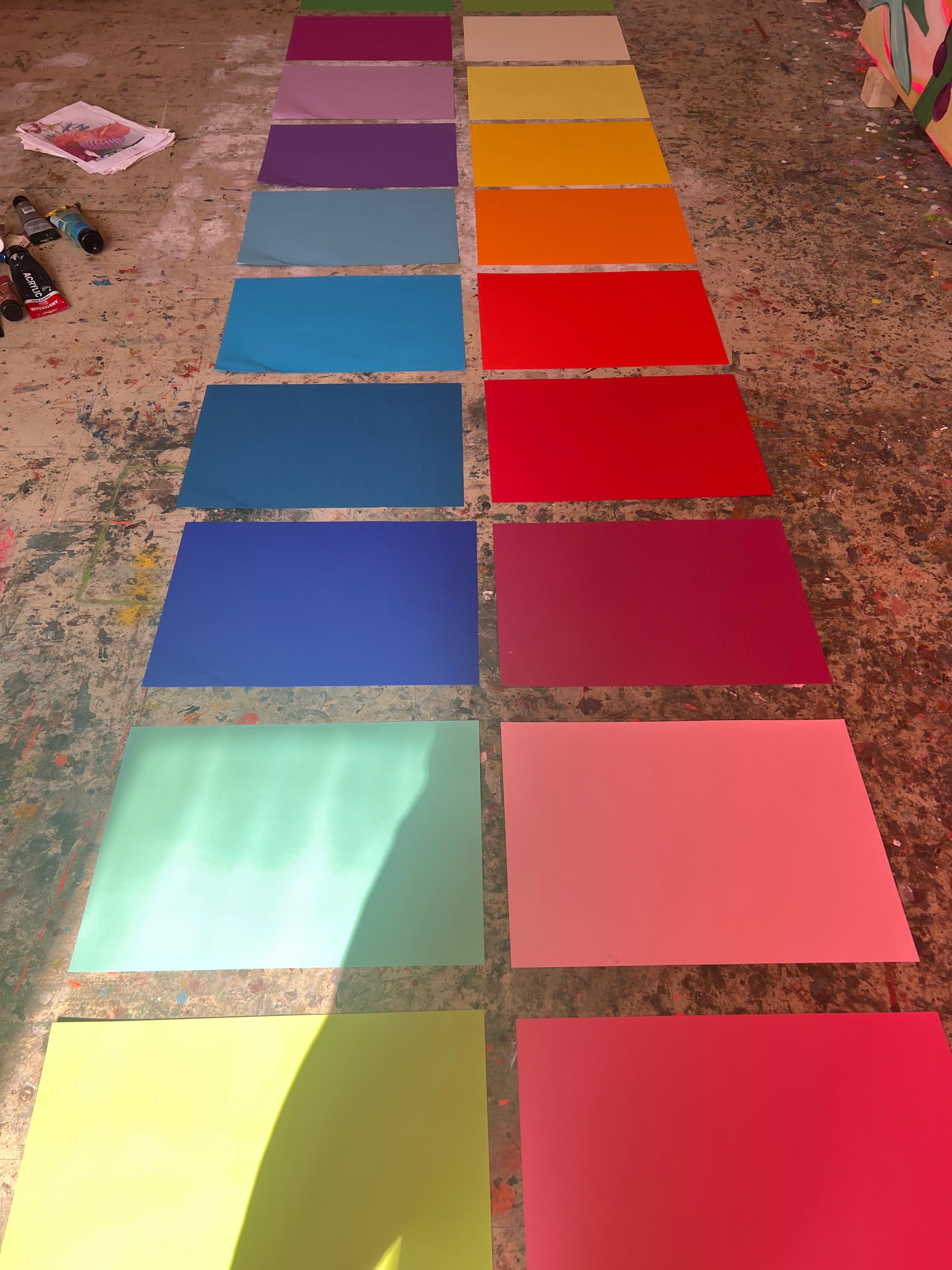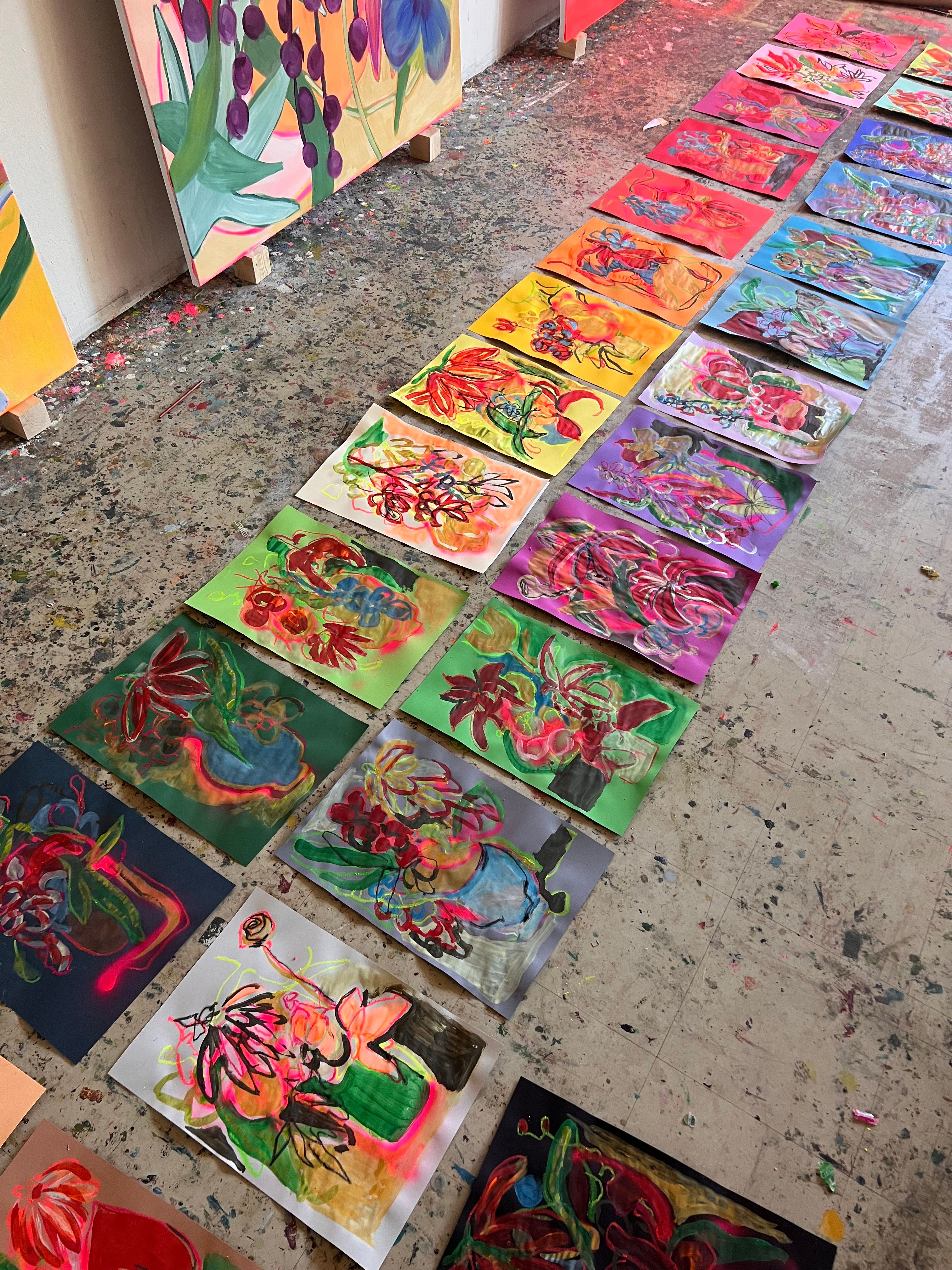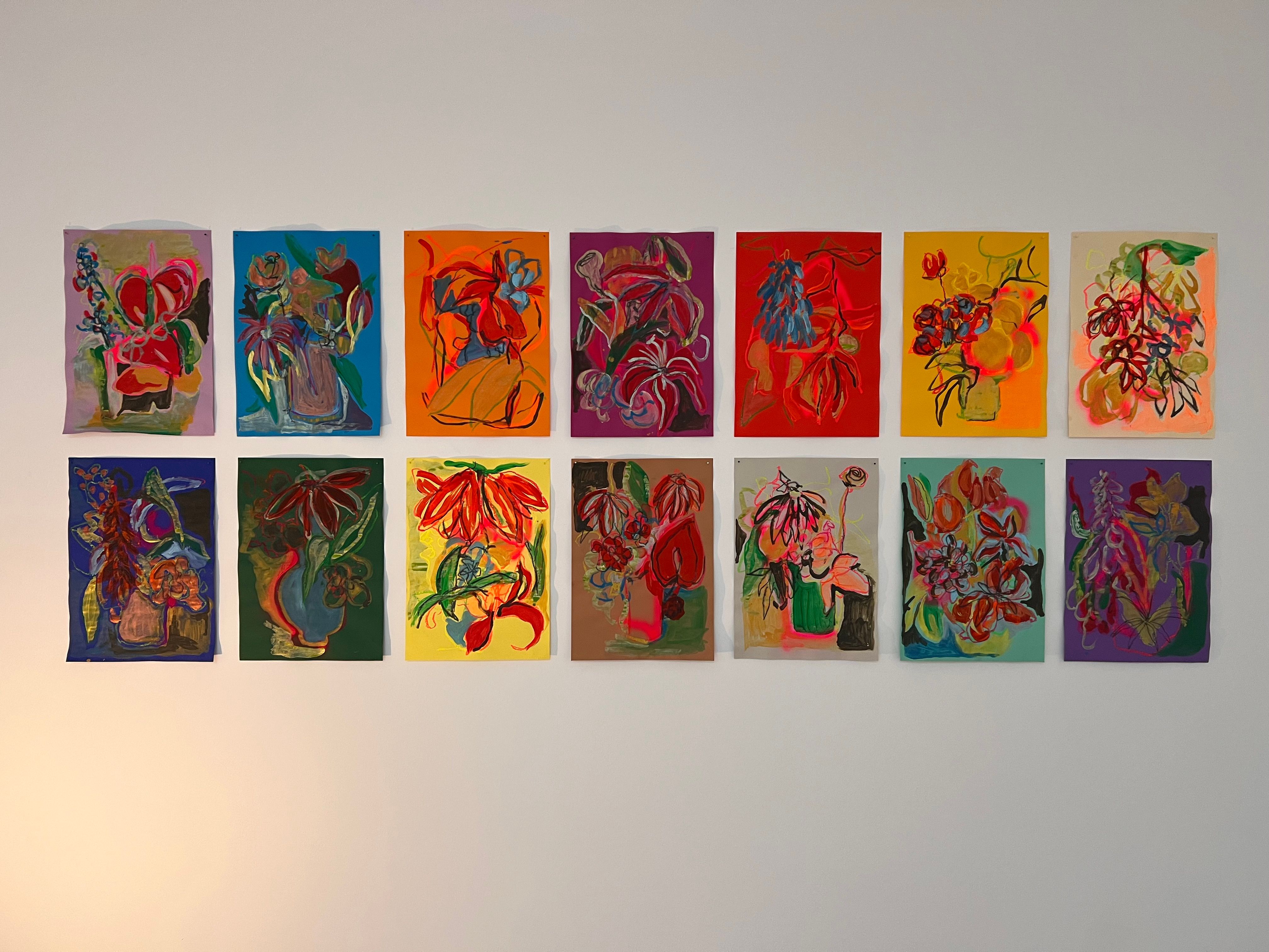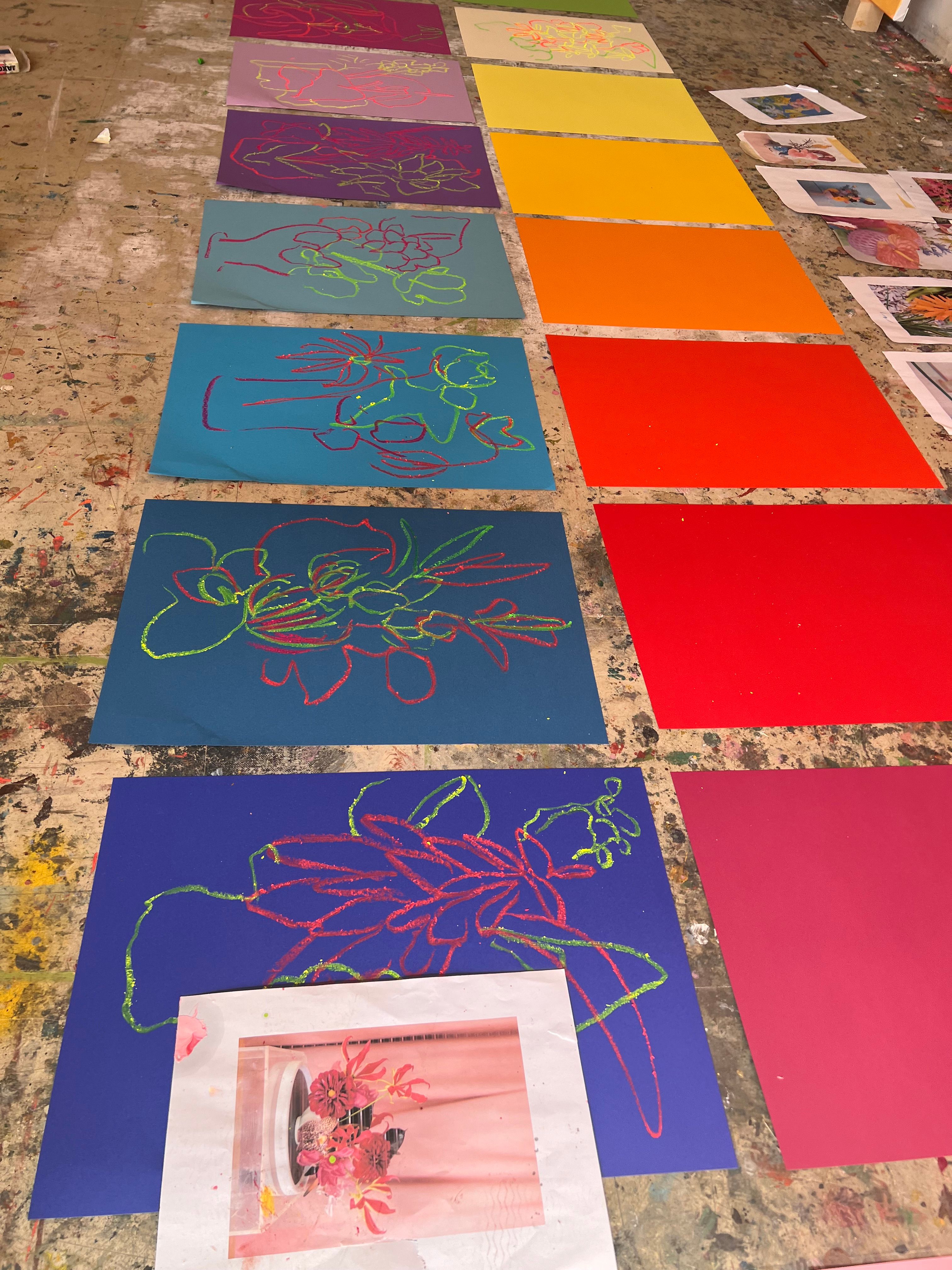 Drawings in Motion" is a series of drawings made on colored paper. The idea behind this series is to have all the drawings created in a single moment, in one continuous motion. At each stage, the artist introduces a new element, such as crayons, paint, or spray, resulting in loose, dynamic drawings that capture the expression of that particular moment.